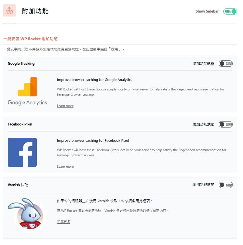 WP Rocket會提供相關的外掛,例如 Google Analytics 、 Facebook Pixel 可以直接在 WP Rocket 啟動,在強化網站功能之餘,也可以減少網站的負擔。